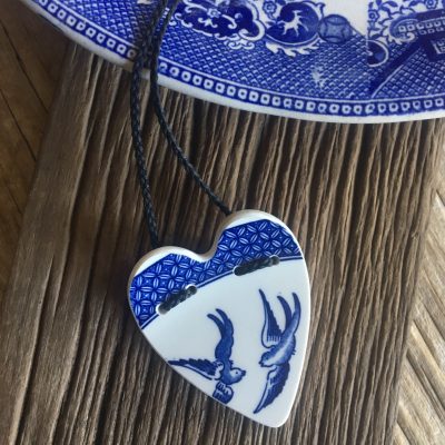 Recycled oval ceramic pendant – Crown Lynn ‘Blue Willow’ trees and temple, retro