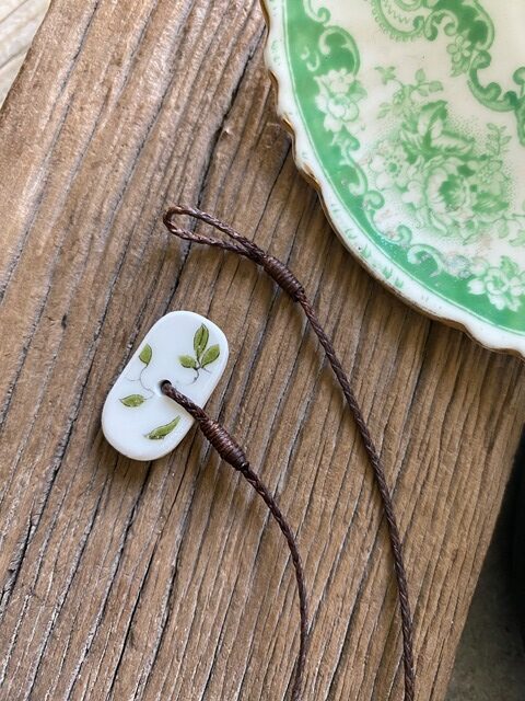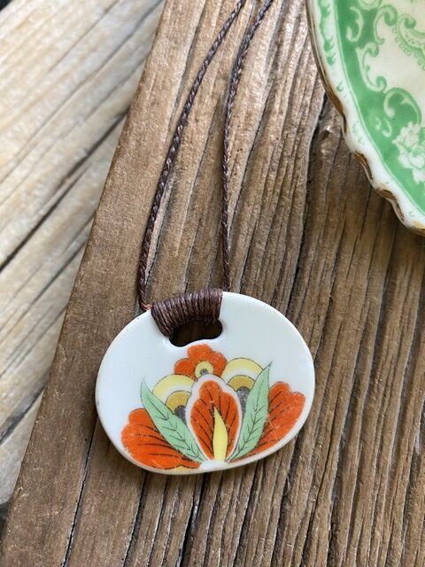 This pendant has been handcrafted from broken/recycled china, and is formed into an elliptical shape. It measures approximately 3.5 cm in height and 4cm in width. The cord is plaited and is attached to the pendant using a unique binding method. The length of the cord is approximately 50 cm; it is designed to sit just below the collar bone. It fastens with a simple loop and toggle system; the toggle matching the china of the pendant.